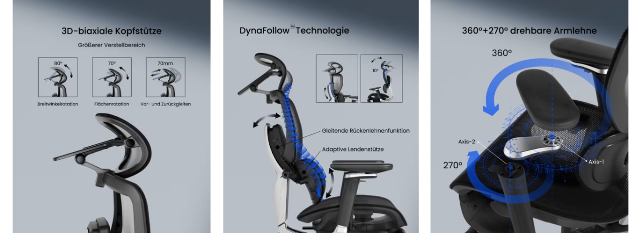 Aber was genau macht diesen Bürostuhl besonders? Da ist zum einen die mehrfach verstellbare Kopfstütze, die Nackenverspannungen vorbeugt. Hinzu kommt der Bürostuhl mit verstellbarer Rückenlehne, die sich dank der sogenannten DynaFollow™-Technologie dynamisch deinen Bewegungen anpasst – egal, ob du dich nach vorn, hinten oder zur Seite lehnst. Damit ist es der ideale Bürostuhl gegen Rückenschmerzen.