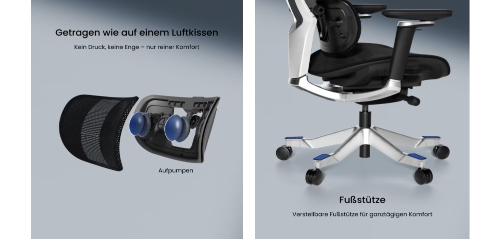 Doch wie gut ist die Lendenwirbelstütze wirklich, und was bringt die optional erhältliche Fußstütze? Schauen wir uns das genauer an.
